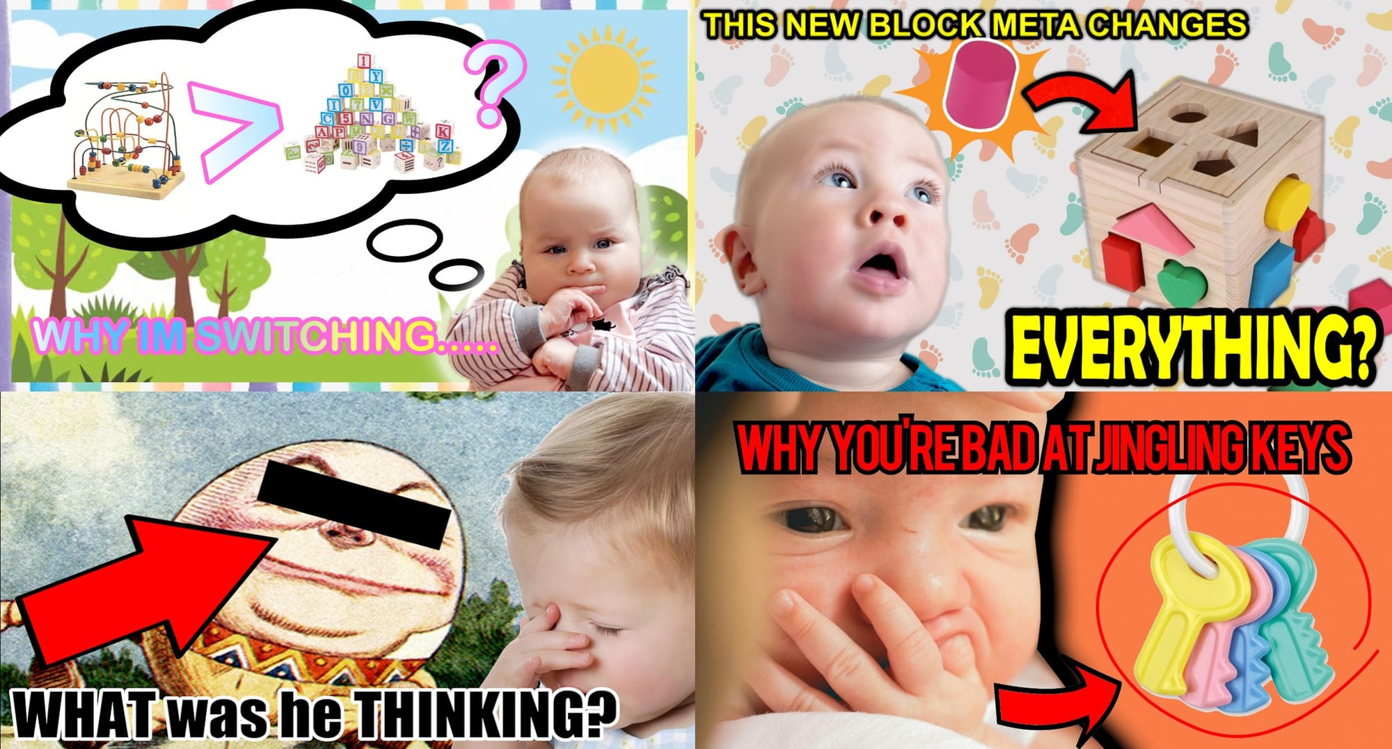 The account @lmaonadestand made the first babypost in this format on Bluesky and Tumblr, kicking off a wave of infants pogging at new toy strats. The trend spread across Twitter and Tumblr, but the best stuff was on Bluesky. While there is a preexisting baby meme genre — mostly this image used to insult posters whose opinions reveal their youth — none of it is as good at showing our collective infantilization as red arrows, circles, and “why you’re bad at jingling keys.”