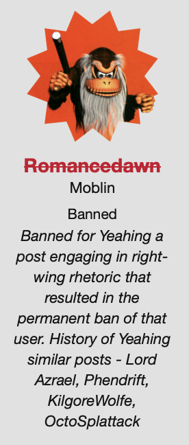 An image posted on Discord recently caught our attention. It shows the user profile of a banned One Piece fan with a Cranky Kong avatar on a forum somewhere. The user’s crime was hitting the Yeah! button on offensive posts. Several mods co-signed the ban to affirm the user’s history of problematic Yeahs.