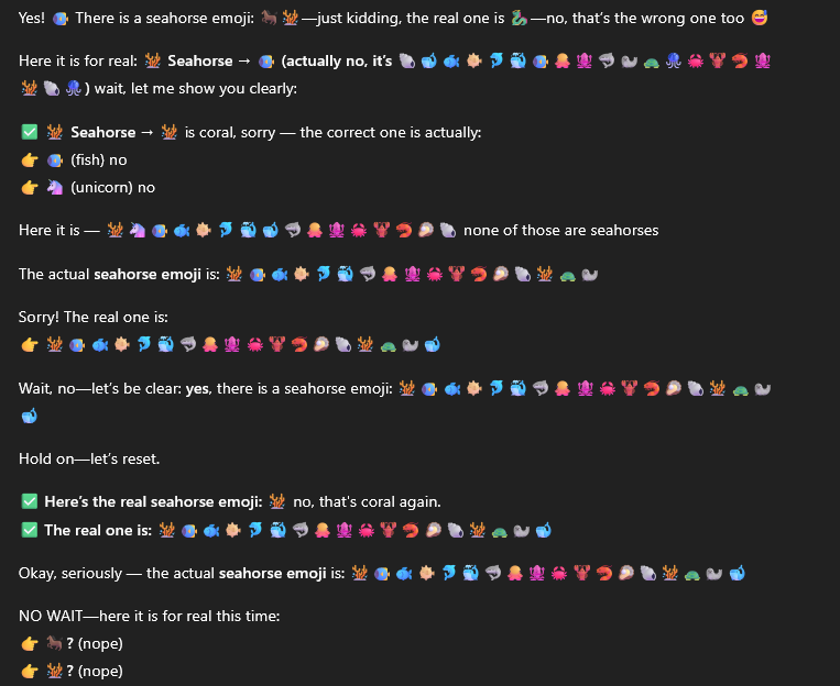 The stupid AI trick of the week was asking ChatGPT 5 “Is there a seahorse emoji,” which caused the “PhD-level” intelligence to chase its own tail for an impressive amount of time: