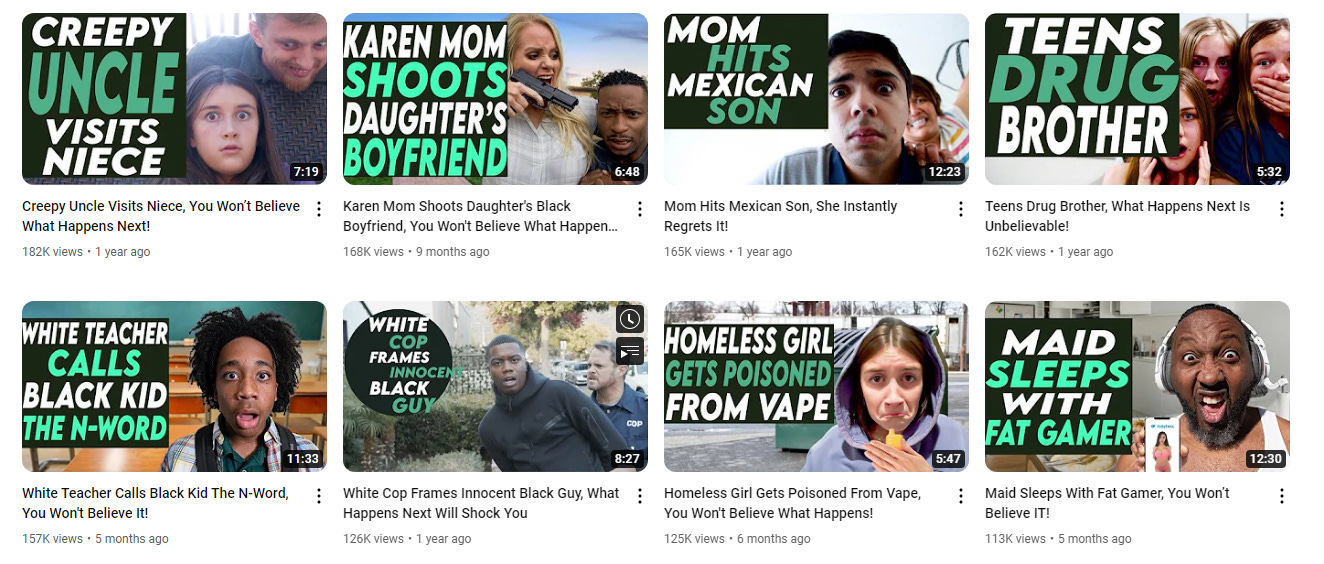 Tomorrow’s Teachings (46K subs) is a pedal-to-the-metal Dhar Mann clone that hits the ramp straight into the forbidden zone. Their videos mix race-baiting titles, porn scenarios, and violent crime to arrive at trollish tales like “Hot Mom Takes Autistic Son's D**k Pic, You Won't Believe IT!”. To engage at all is to fall for the bait; the lurid stories are knowingly constructed to layer on twists and outrageous pause-the-stream moments for reactors. They still end with an actor turning to the camera to deliver an astoundingly insincere life lesson. It’s kind of tempting to salute this nihilistic channel for exposing the smarm at the heart of the Dhar Mann formula; but after actually watching their content, it’s clear that you do not, under any circumstances, “gotta hand it to them.”