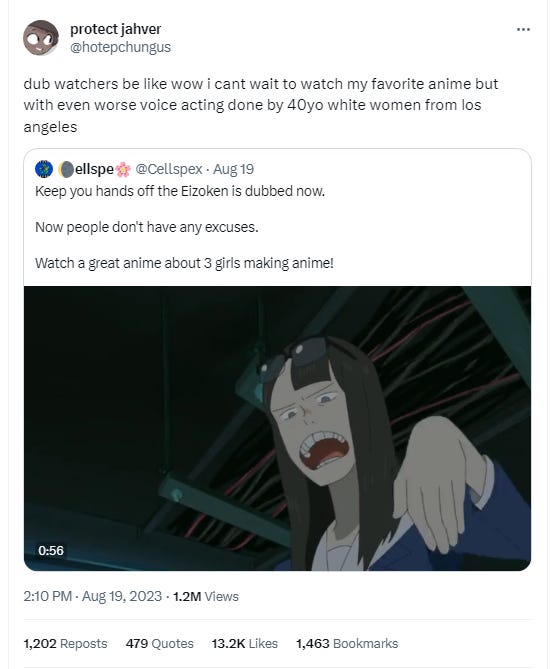 Somehow, subtitles vs. dubs discourse has returned. It’s unclear whether this was caused by an unappealing clip of the dub for the anime Keep Your Hands Off Eizouken! on Twitter, the recirculation of a parody dub of Breaking Bad on Twitter and Tumblr, or some cyclical internet phenomenon that returns every three years. The dub defender side of this debate usually seems about as formidable as the Washington Generals on social media, so it’s surprising to see anyone new willingly wade into it. While many Netflix and Hulu viewers happily watch dubs, the online discourse is dominated by hardcore fans, and they will track you down and kick your ass if you refuse to read. Even at EX, ⅔ of our staff agrees: when it comes to anime, we prefer subs to dubs.