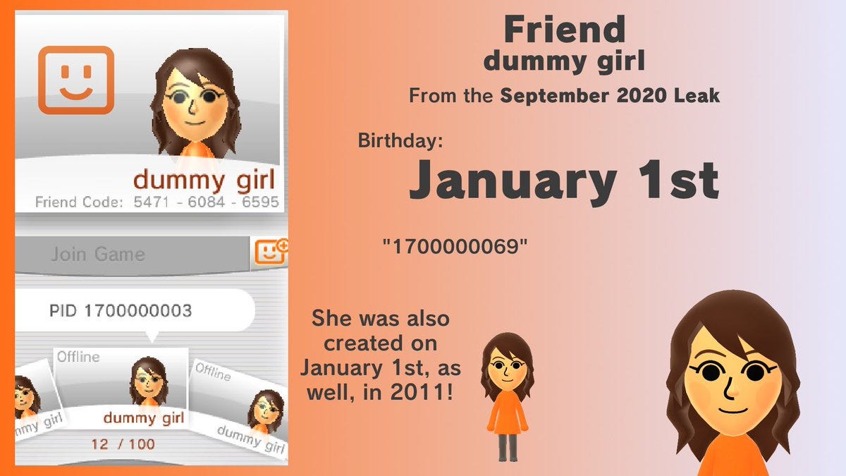 On January 1st, @MiiBirthdays — a Twitter account that draws from a database of official Miis and posts every time one of them celebrates a birthday — introduced Twitter to “the Friend,” a placeholder Mii with the nickname “dummy girl.” Originally accessible solely through the 3DS debug tool, dummy girl went public as a part of the massive Nintendo data leak from September of 2020. It wasn’t long before people fell for her vacant, jet black stare. Within days, dummy girl became the subject of numerous pieces of fan art, following in the footsteps of other non-canonical Nintendo characters like Bowsette and, more recently, Wa-Peach.