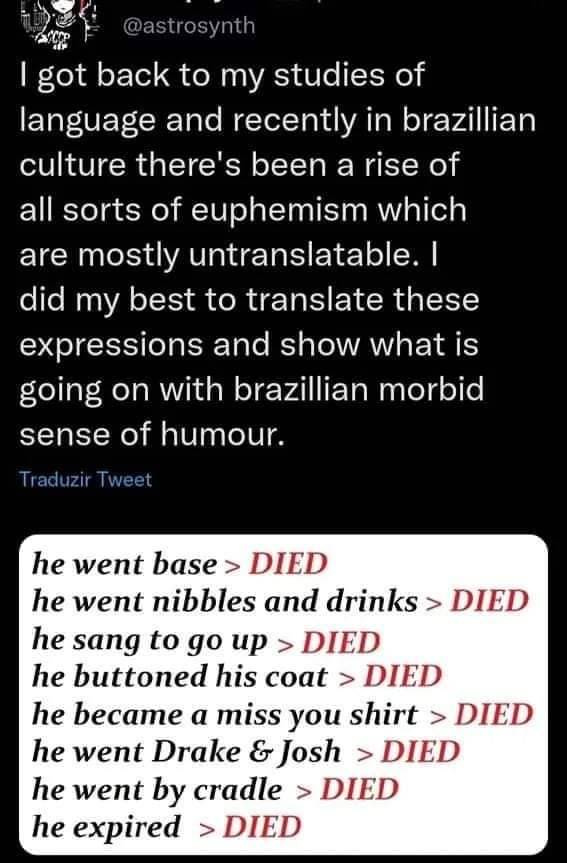 A tweet about unusual Brazilian euphemisms for death recirculated on Tumblr this week. The post seems to resurface periodically as users imagine a more creative process for working around automated content filters like those on TikTok and YouTube. “Algospeak” like “unalived” is already common in the US, but many find it a numbingly stupid way to talk; however widespread the Brazilian slang actually is, at least it’s funny.