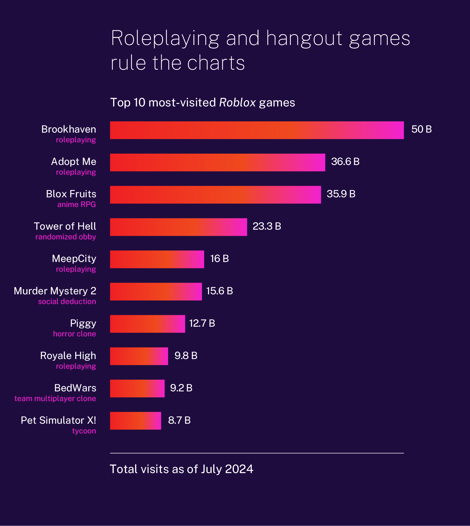When asked about their favorite games, most players’ picks were from the top of the charts: social roleplaying game Adopt Me!, anime MMORPG Blox Fruits, dress-up game Dress to Impress (“dti”), social deduction game Murder Mystery 2 (“mm2”), multiplayer action game BedWars, or asymmetric horror game Survive the Killer (“stk”).